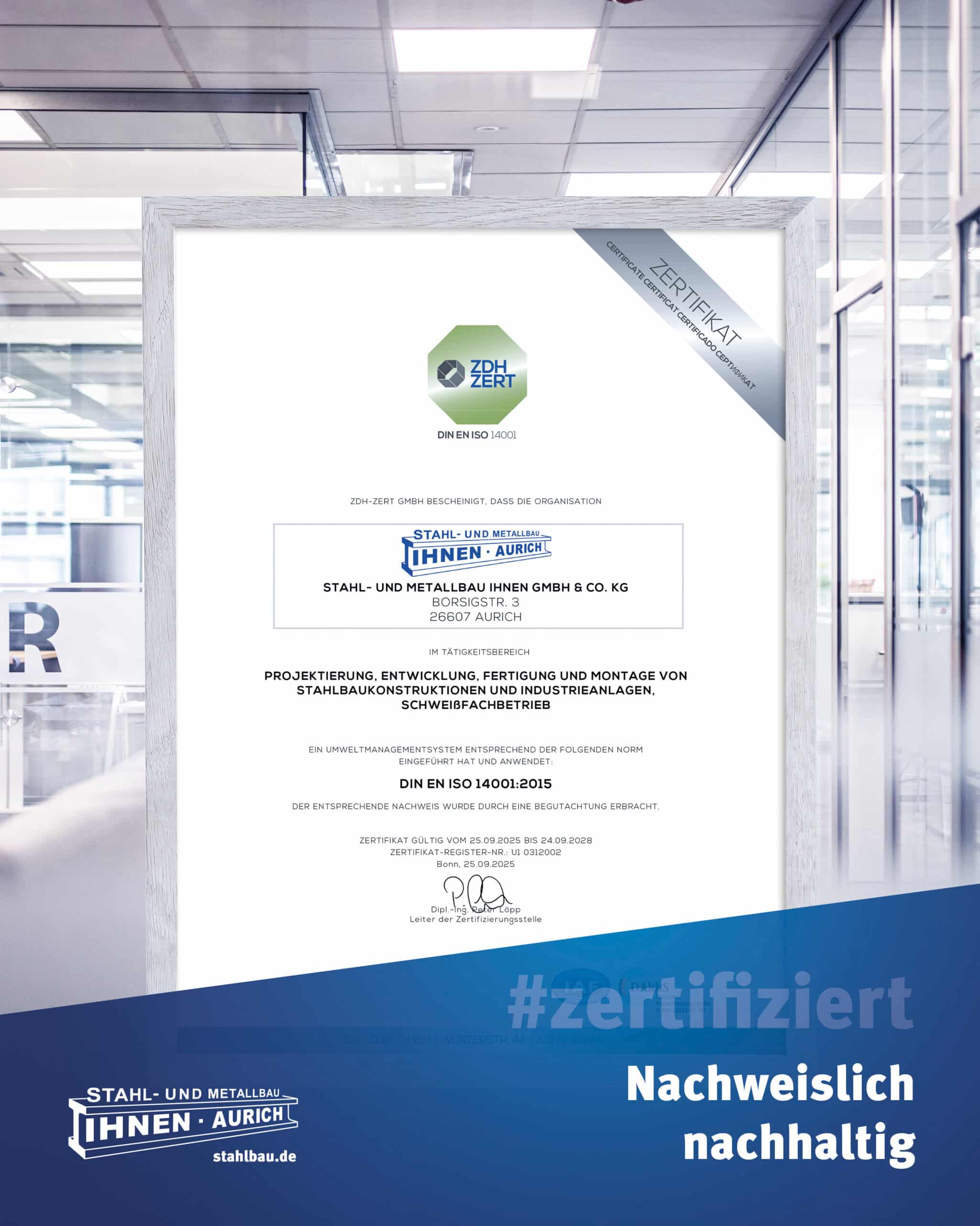 Wir freuen uns, die erfolgreiche Zertifikatsübergabe an die Stahlbau Ihnen GmbH & Co. KG an Edith Ihnen und Martina Miczek bekannt zu geben. In enger Kooperation haben wir ein herausragendes Projekt umgesetzt und sind begeistert von den gemeinsamen Ergebnissen.